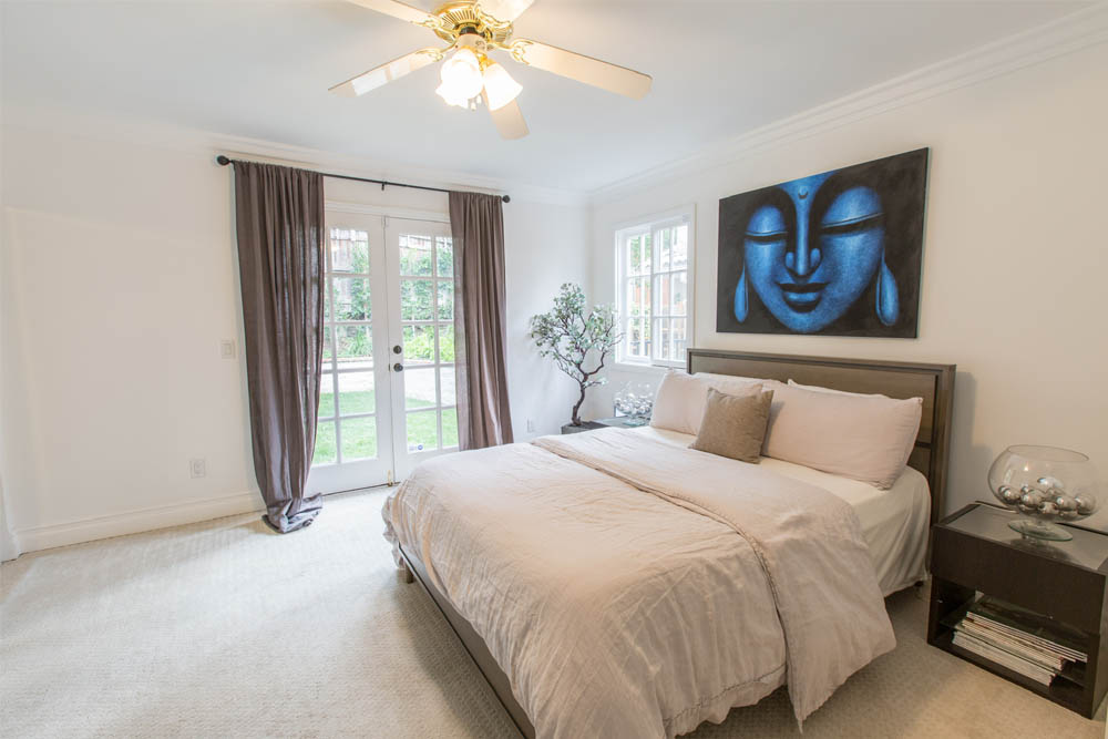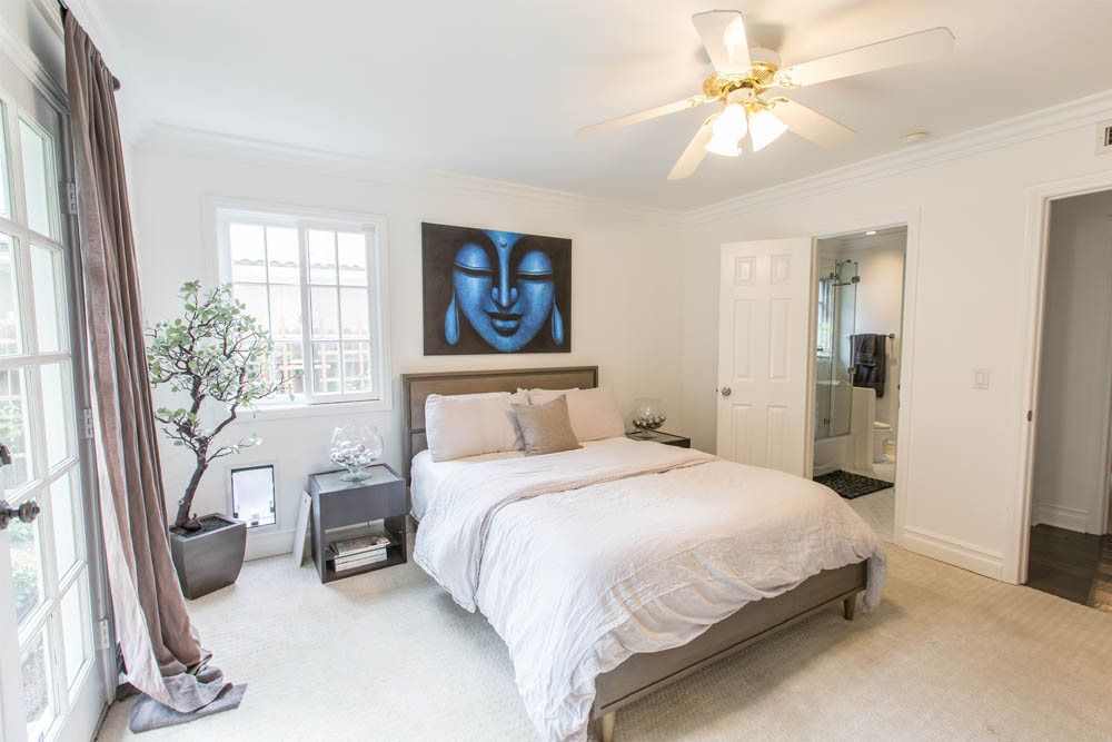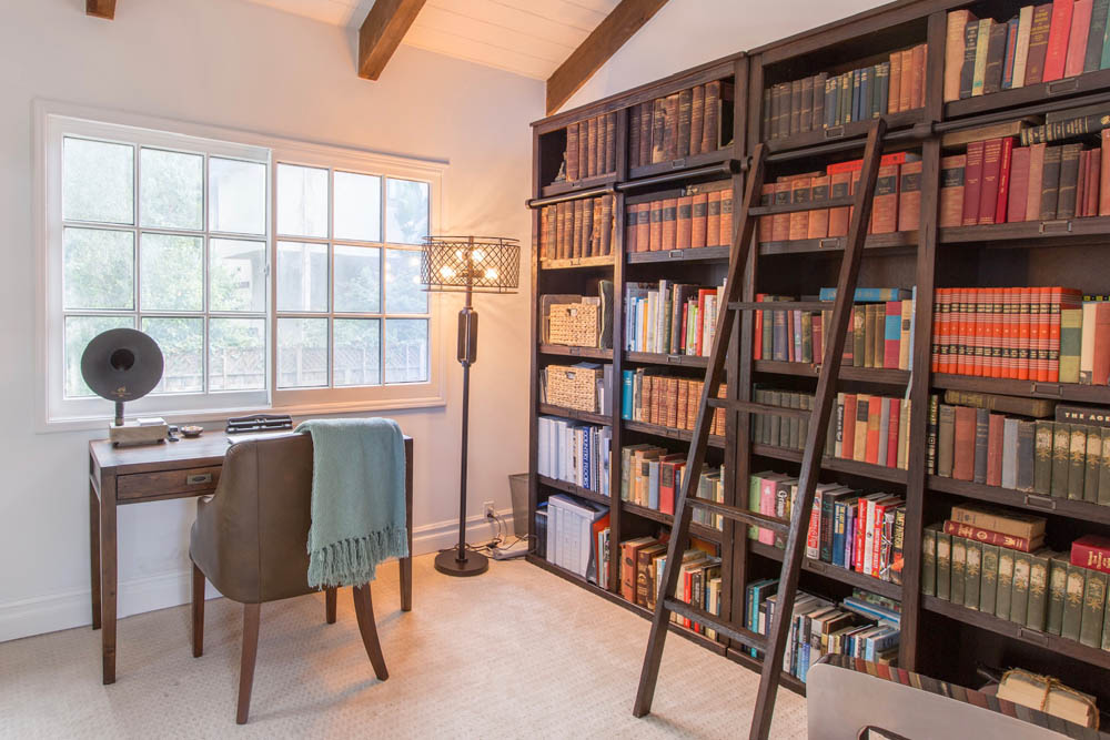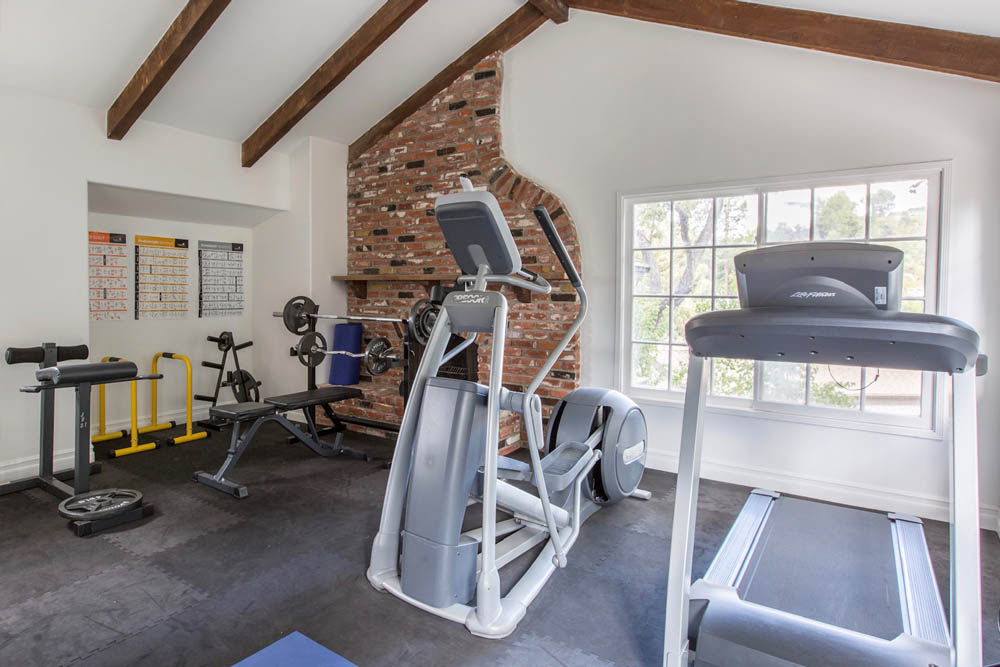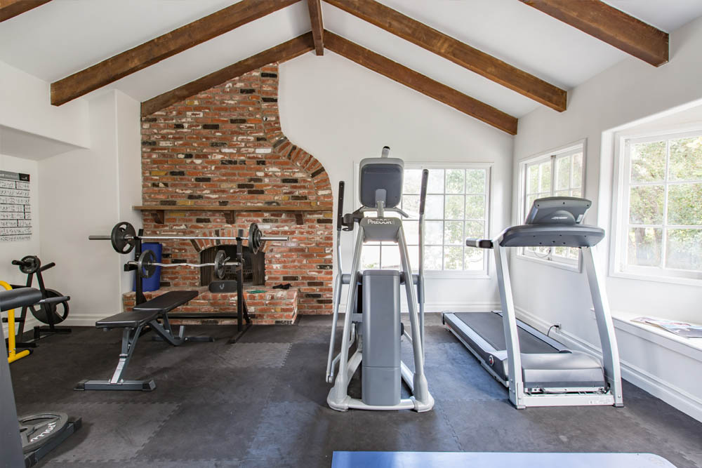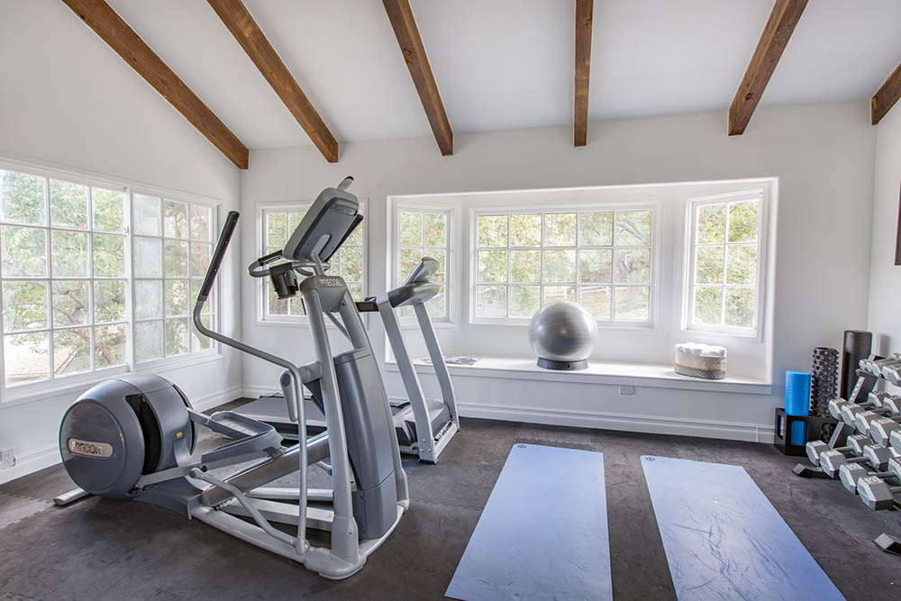 There is another large bedroom upstairs with a huge fireplace and wood floors, currently set up as a fully equipped home gym, as well as the fifth bedroom with views of the backyard. This property sets the bar for privacy and luxury in the celebrity-filled neighborhood of Calabasas.